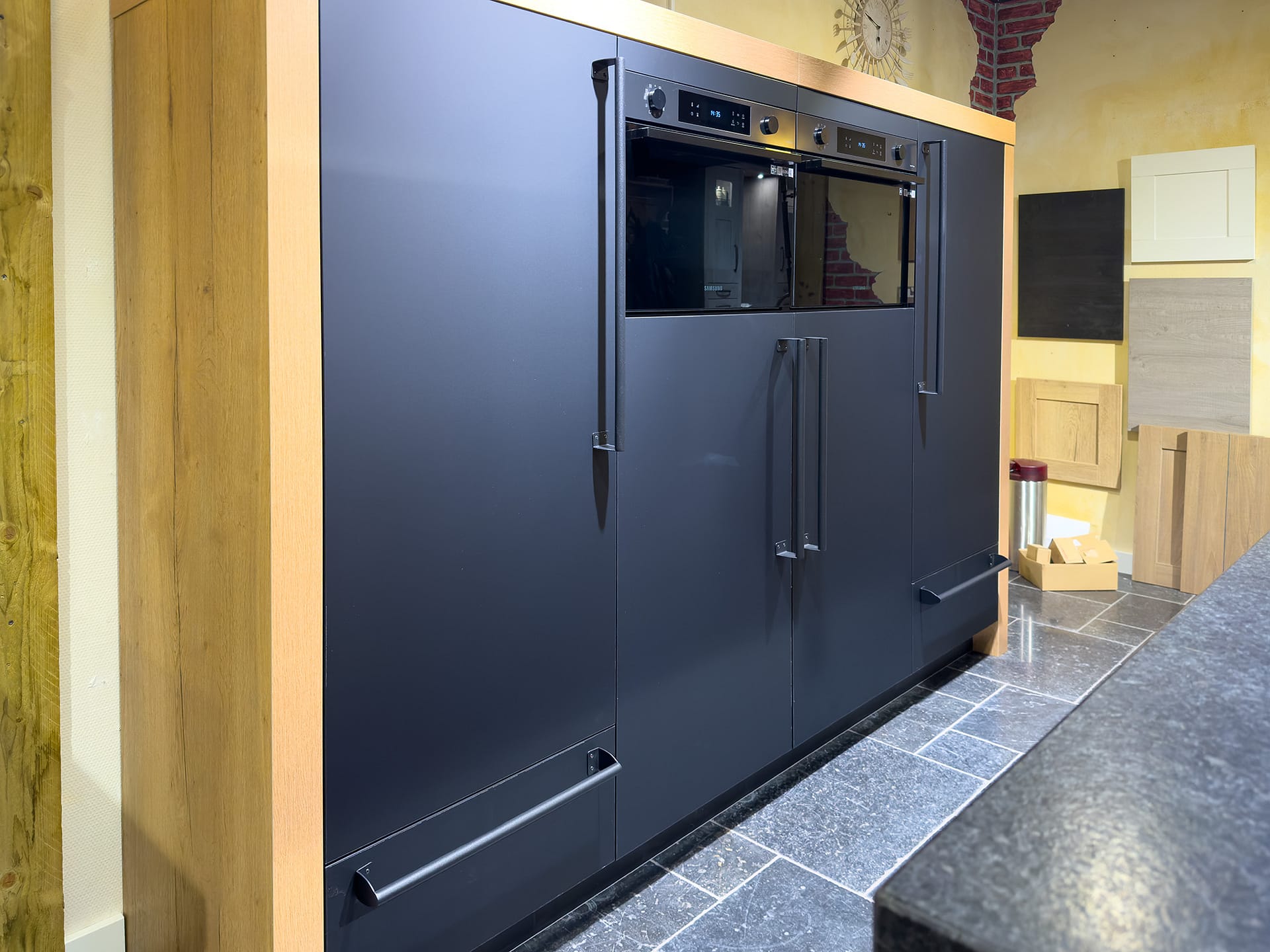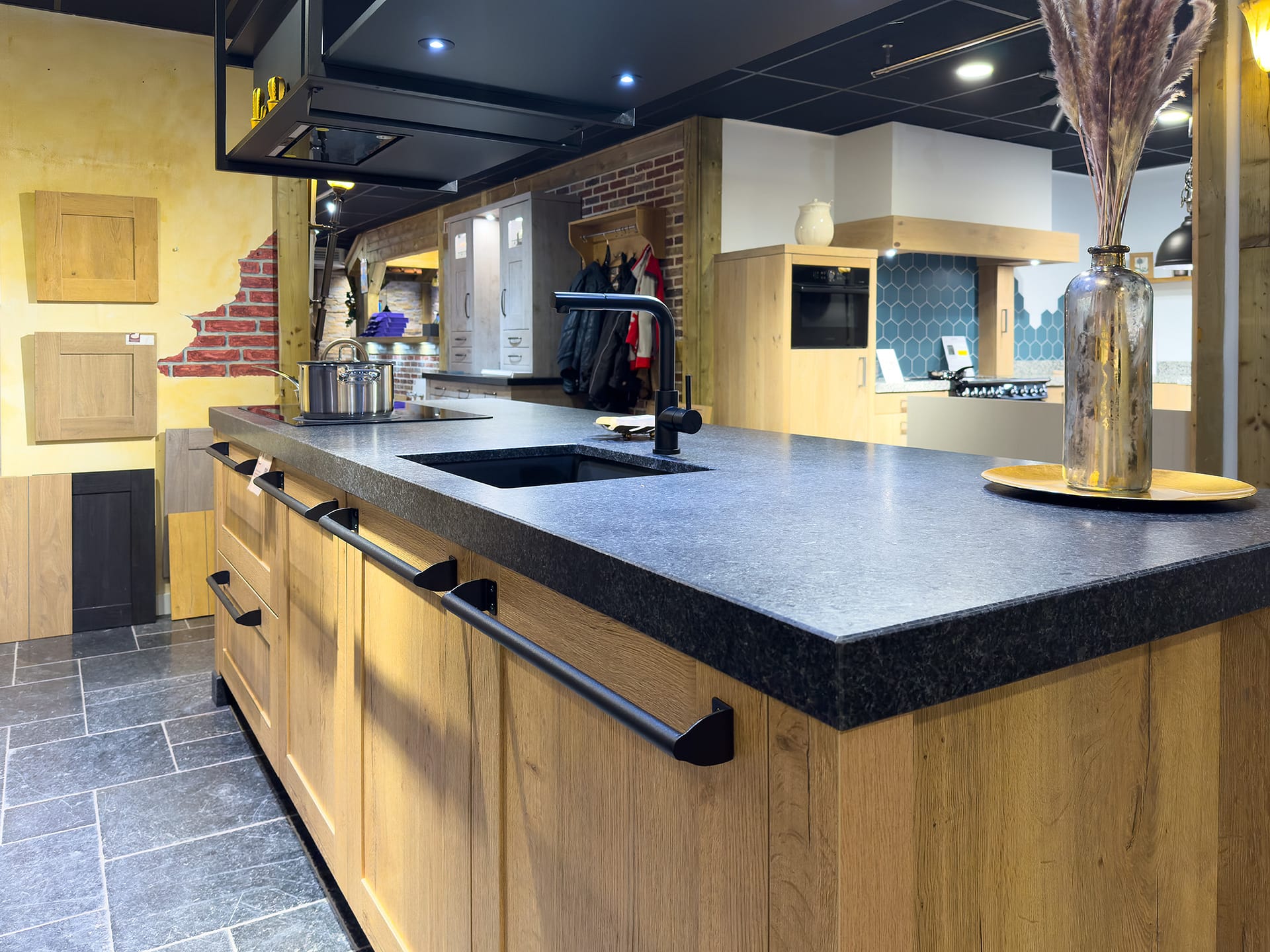 Deze keuken is een krachtig voorbeeld van landelijke charme met een stoer randje. De combinatie van zwarte en nature split oak fronten zorgt voor een warm maar robuust geheel. Het werkblad in Angola black vormt een stijlvol contrast en straalt kracht en duurzaamheid uit – perfect passend bij het rustieke karakter van deze keuken.