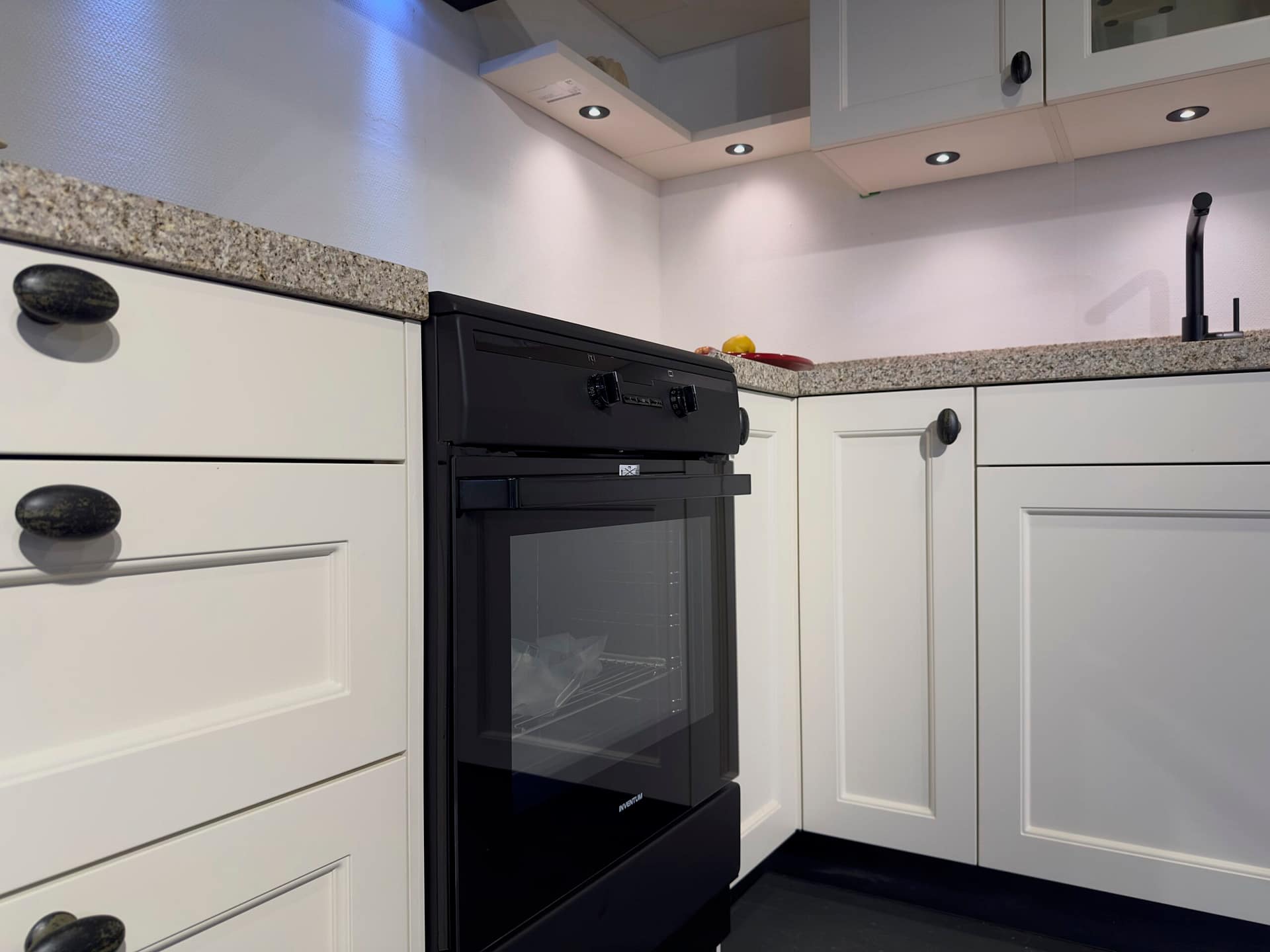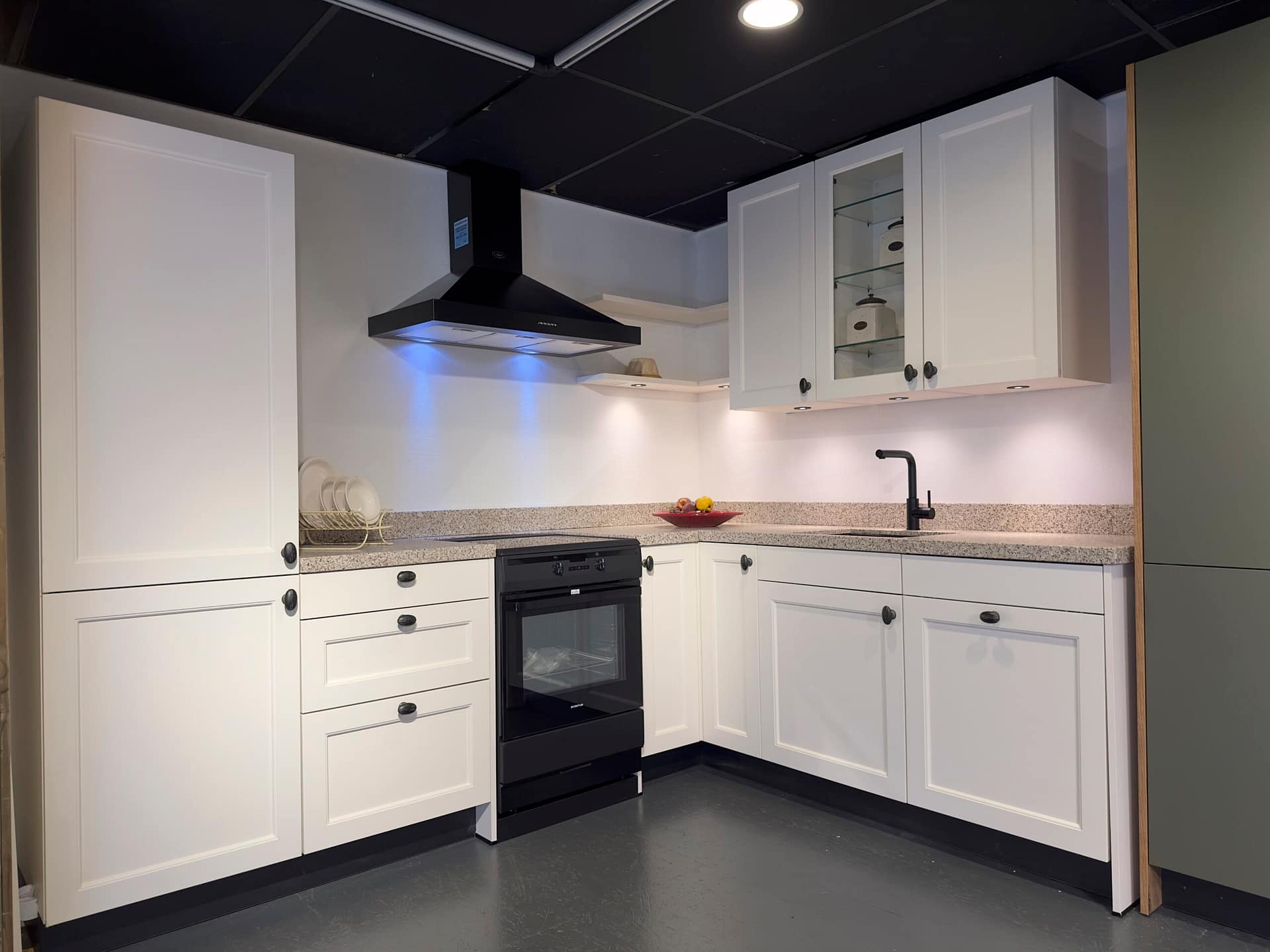 De praktische hoekopstelling biedt volop werkruimte en een efficiënte indeling. Deze keuken is voorzien van betrouwbare apparatuur van Inventum, waaronder een fornuis, koelkast en vaatwasser. De afzuiging van Belling is stijlvol geïntegreerd en past mooi bij het klassieke totaalbeeld.