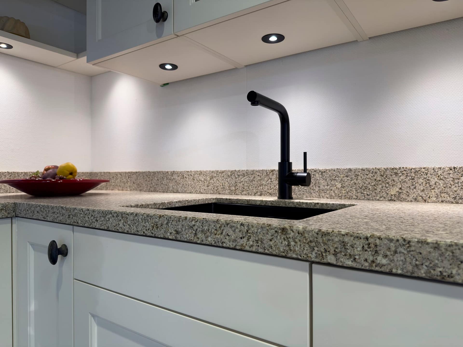 Het werkblad is uitgevoerd in het natuursteen chin ivory, een elegante steensoort met een zachte, lichte tint. De afwerking voegt een vleugje luxe toe, terwijl het materiaal duurzaam en onderhoudsvriendelijk blijft.