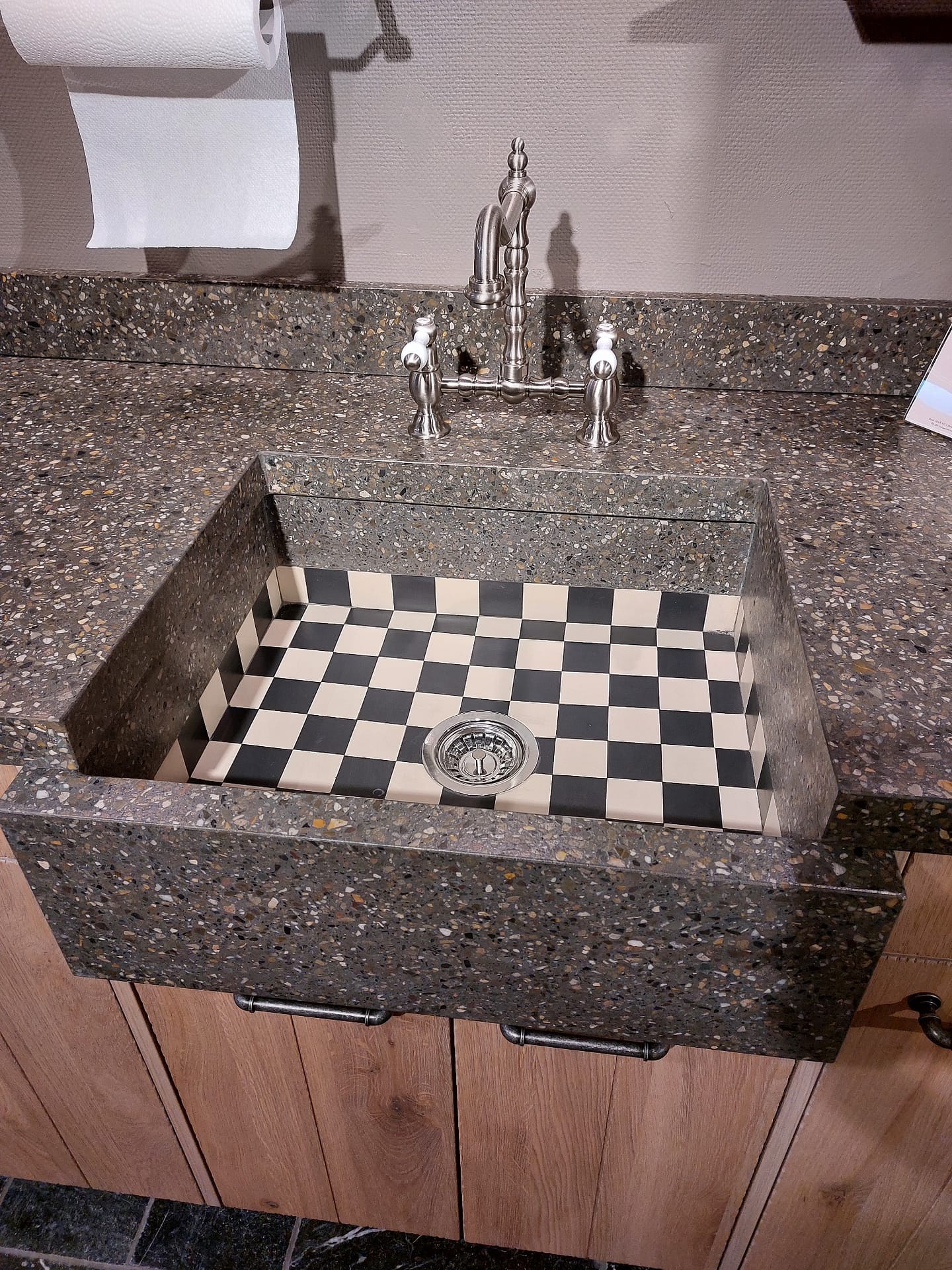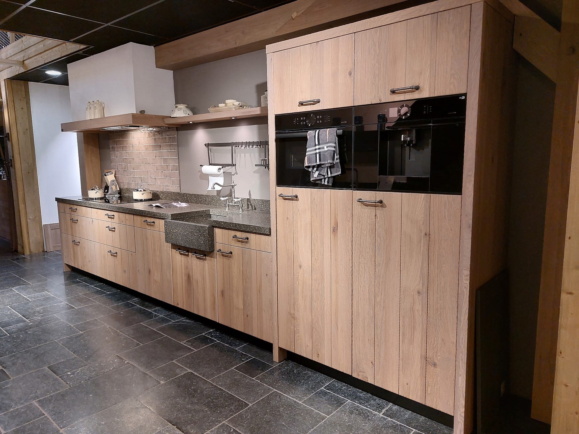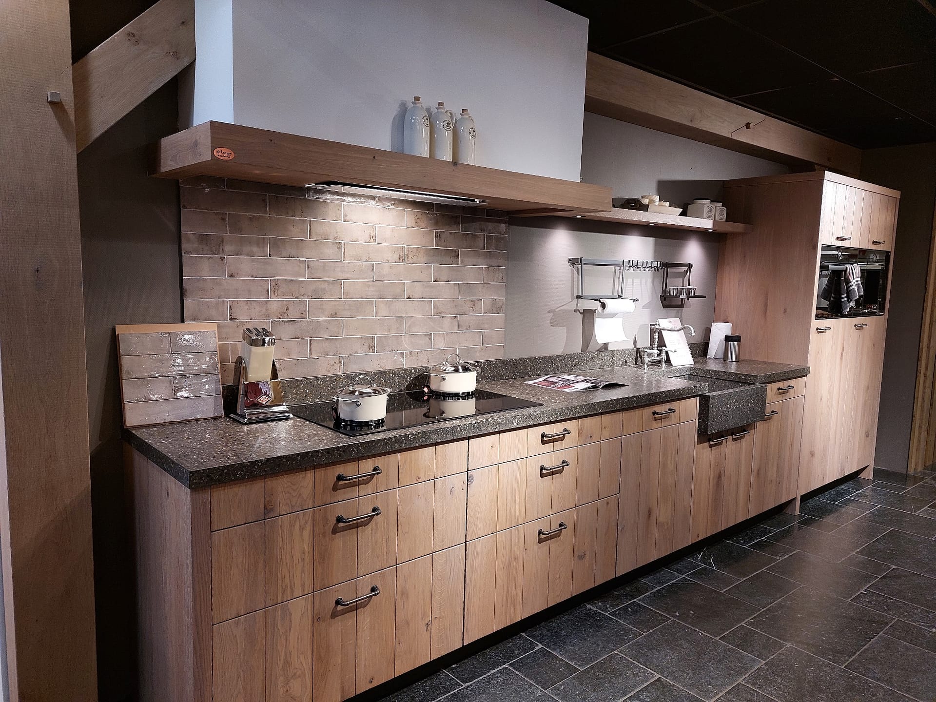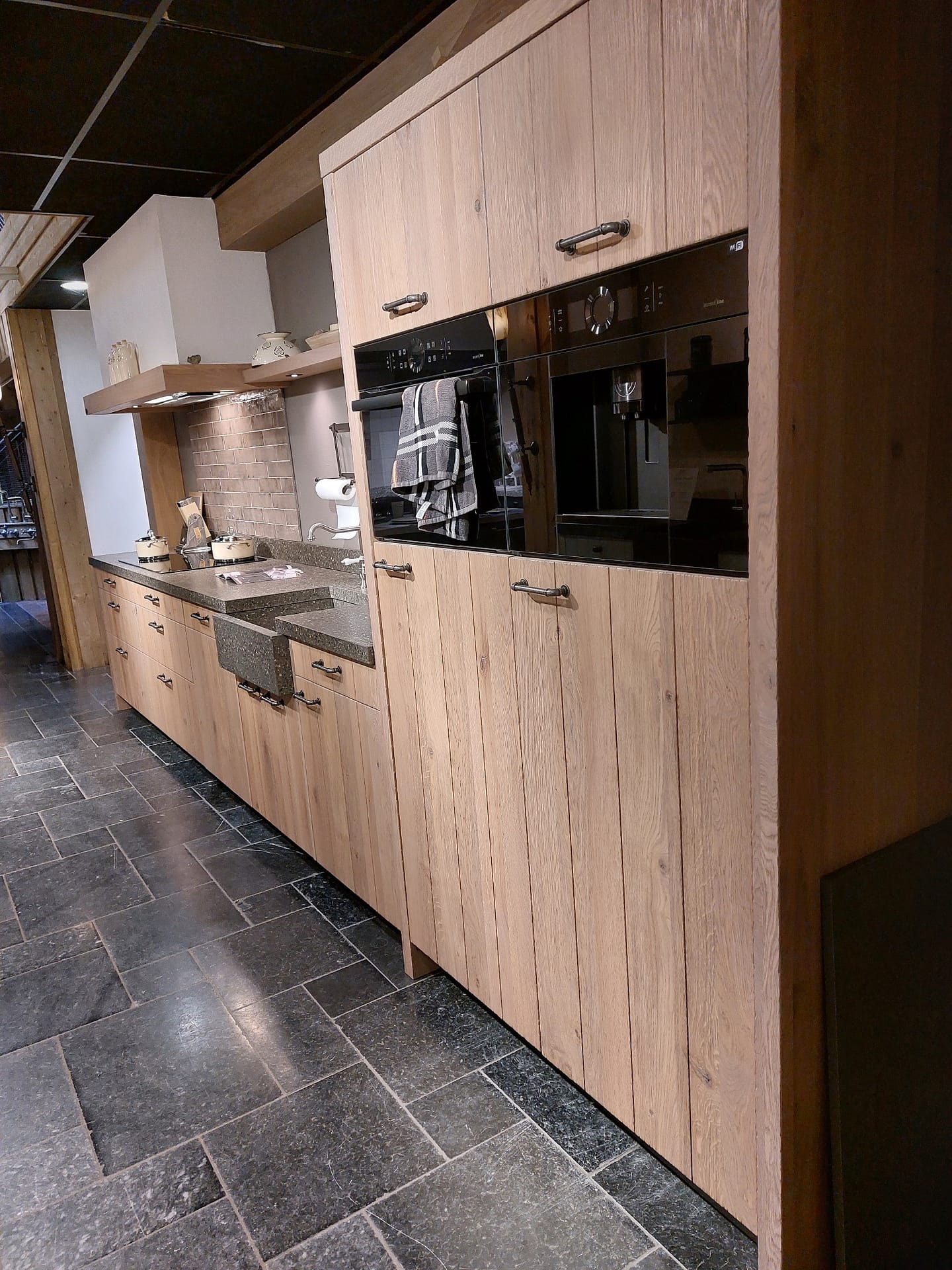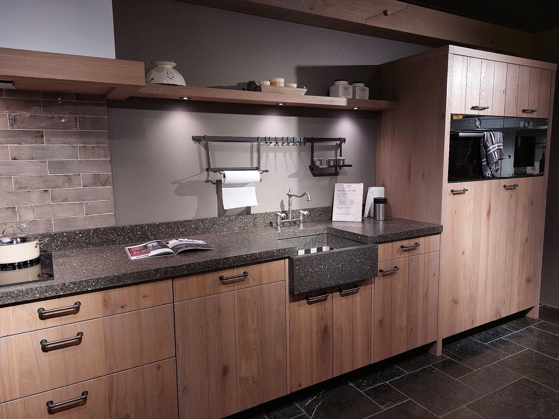 Deze landelijke keuken ademt sfeer en vakmanschap dankzij de bijzondere combinatie van kleuren en materialen. De fronten zijn uitgevoerd in triple massief eiken, in de tint oakham 150 en zorgvuldig geborsteld voor een natuurlijke, doorleefde uitstraling. De verflaag in sky grey brengt rust en elegantie in het geheel. Het terrazzo werkblad in beige vormt een prachtig contrast en geeft de keuken een klassieke, ambachtelijke uitstraling.