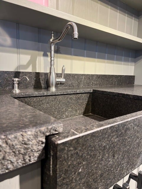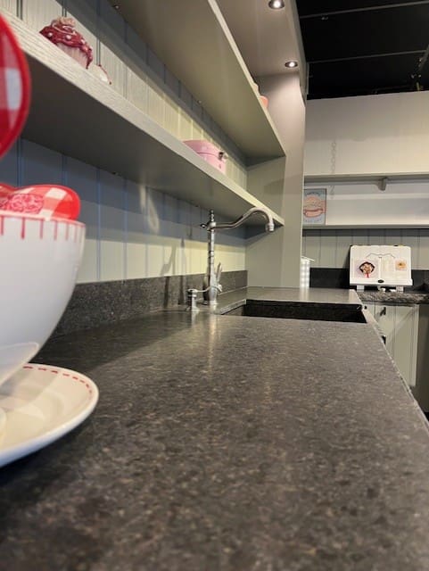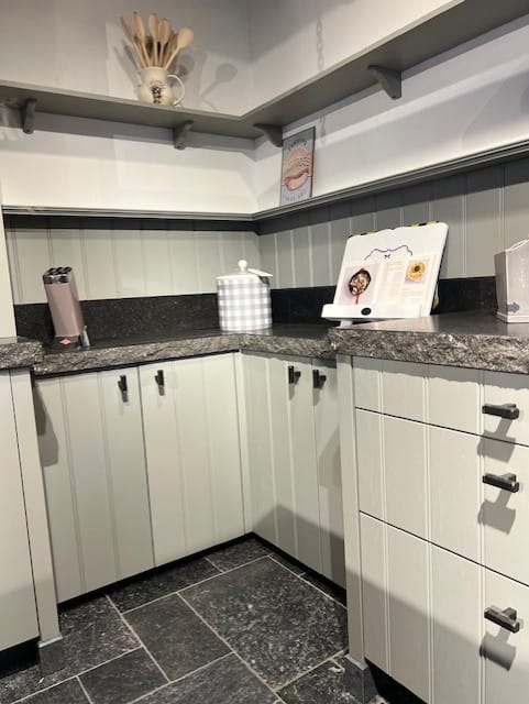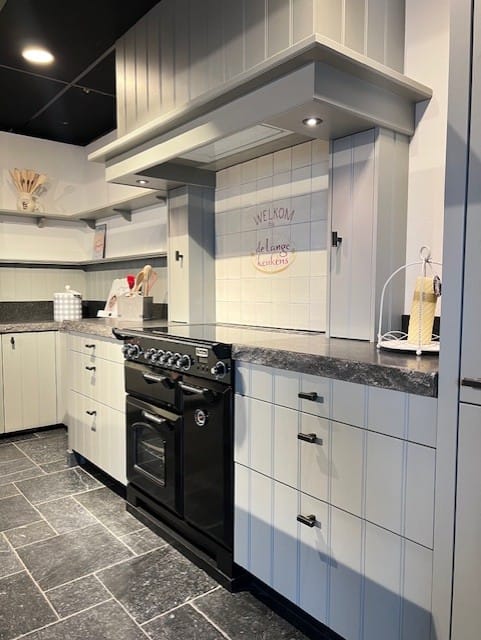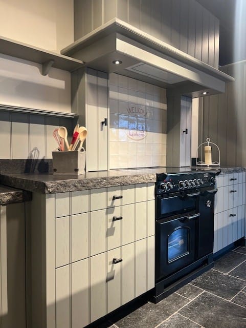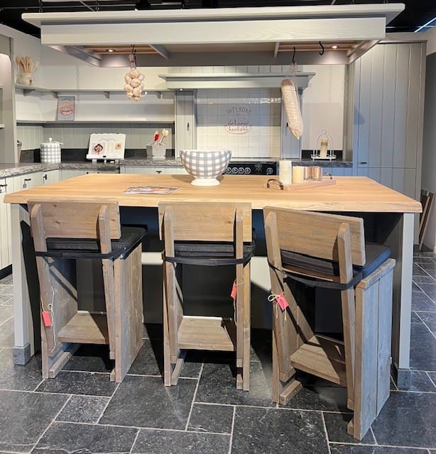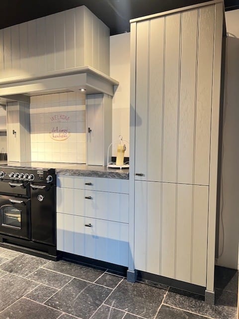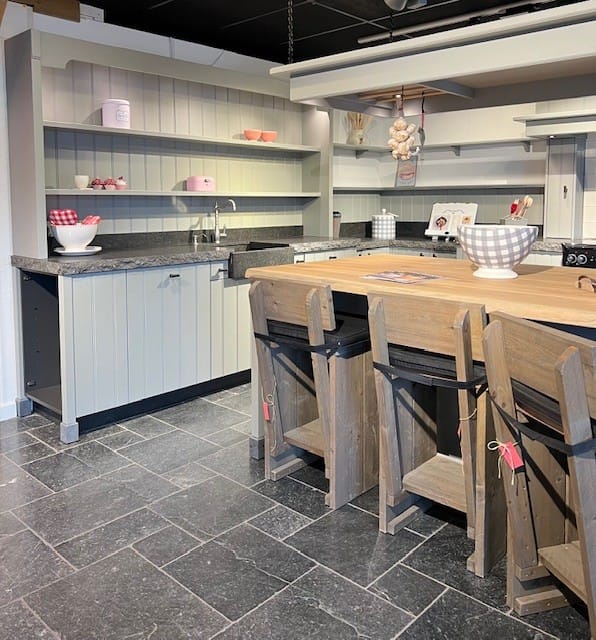 Het royale keukeneiland is afgewerkt met verticale panelen in een zachte, landelijke kleur geven het eiland een vriendelijke en rustige uitstraling. De houten barkrukken met donkere zitkussens versterken het rustieke karakter en nodigen uit om gezellig aan te schuiven. Boven het eiland hangt een sfeervol en functioneel element met houten roosters, ideaal voor het ophangen van keukengerei of decoratieve items een subtiel detail dat het landelijke gevoel versterkt. De achterwand is voorzien van open planken en lichte fronten, wat zorgt voor een luchtige en uitnodigende uitstraling. Het geheel wordt gecompleteerd met een natuurstenen vloer die de keuken een solide basis geeft. Uitgerust met een vaatwasser van Siemens, een Falcon inductiefornuis, een grote Liebherr koelkast en een retrokraan met zeeppomp.