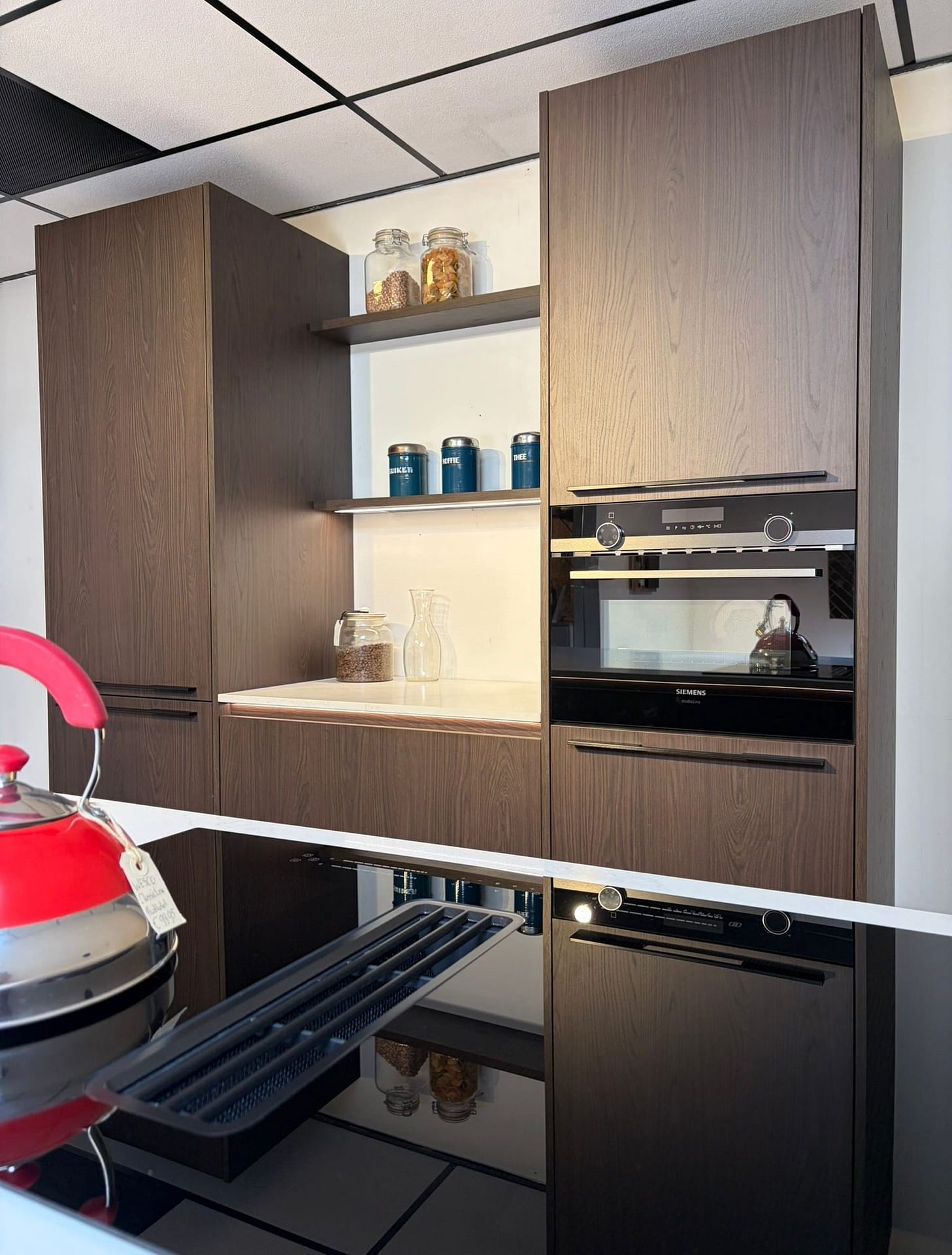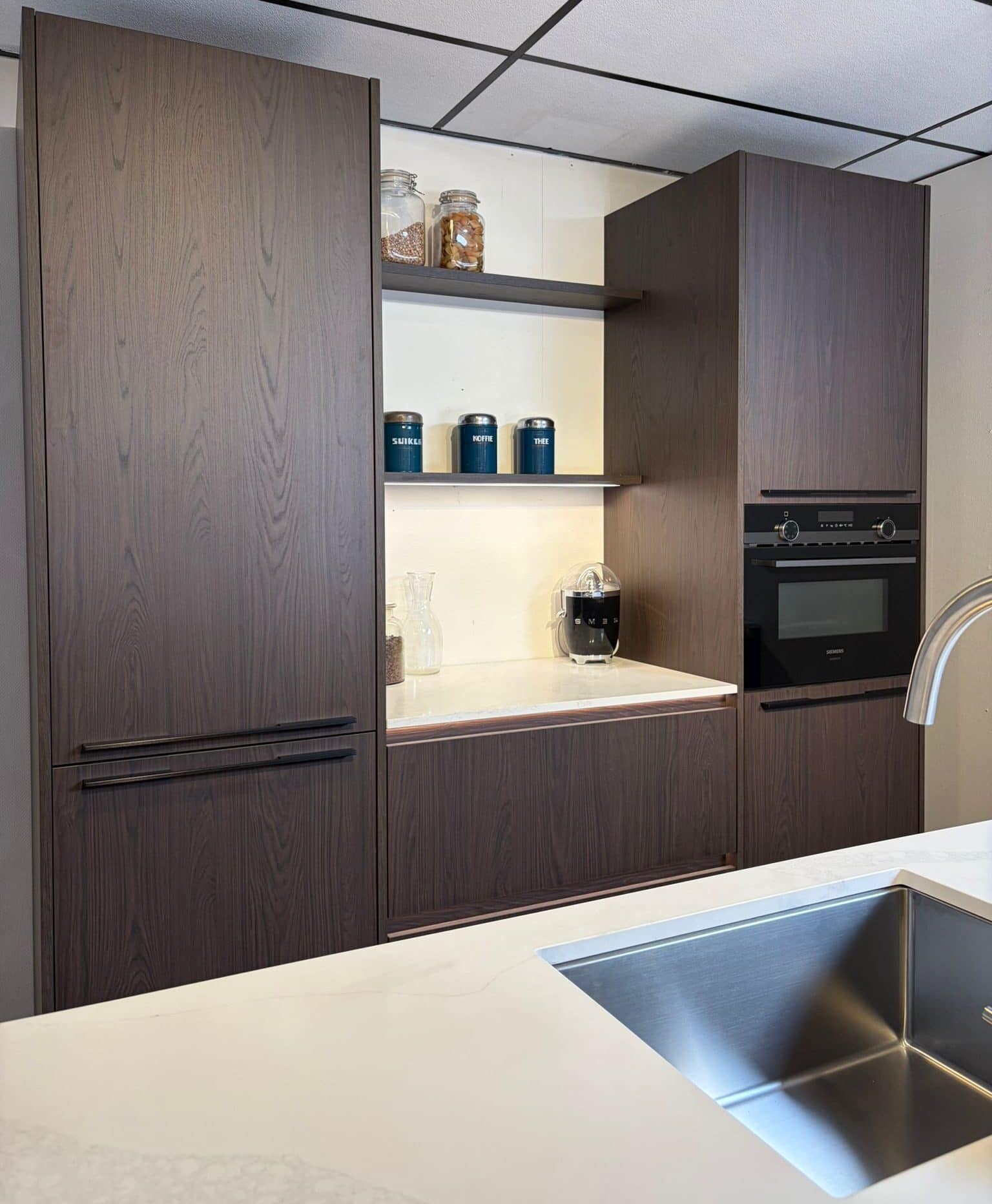 Een echte blikvanger in deze keuken is de open nis in de kastenwand. Deze nis is voorzien van subtiele verlichting en praktische legplanken, waardoor er een mooie plek ontstaat voor keukenaccessoires, voorraadpotten of een koffiemachine. Dit detail zorgt niet alleen voor extra gebruiksgemak, maar geeft de keuken ook een luxe en moderne uitstraling.