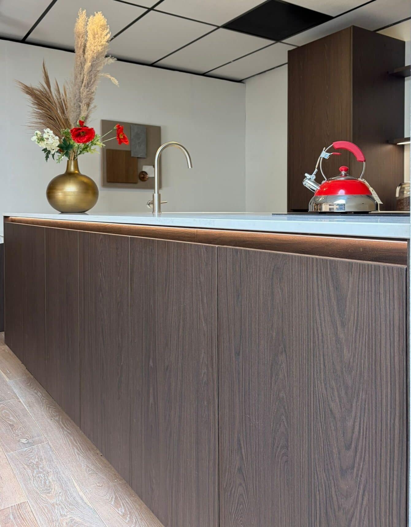 Deze moderne keuken straalt rust, luxe en warmte uit dankzij de donkere houtlook fronten in combinatie met een strak licht werkblad. Het ruime kookeiland vormt het hart van de keuken en biedt volop werk- en opbergruimte.