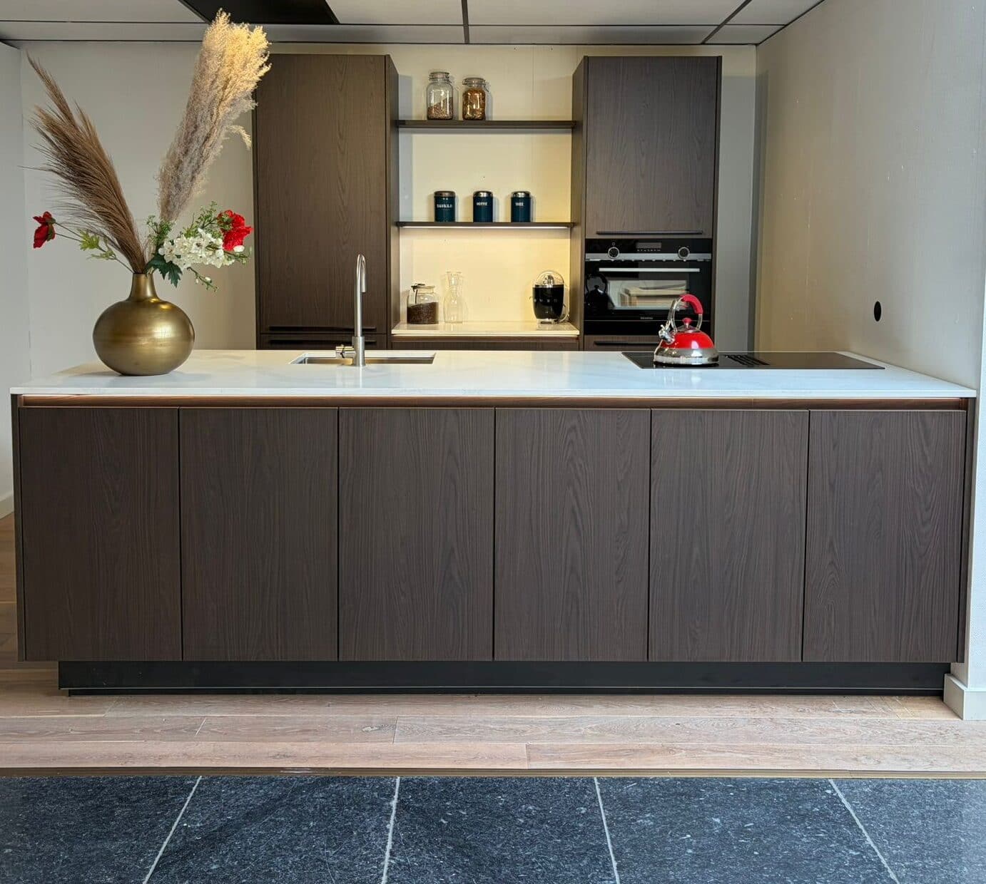 De keuken is daarnaast uitgerust met hoogwaardige apparatuur, waaronder een Siemens oven, een kookplaat met werkbladafzuiging en een stijlvolle spoelbak met designkraan. Dankzij de slimme indeling en het ruime eiland is er volop plek om te koken, te werken en gezellig samen te komen.