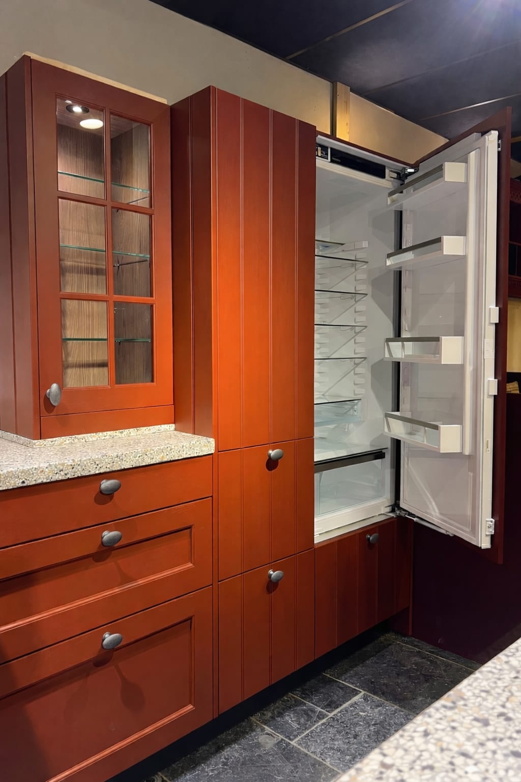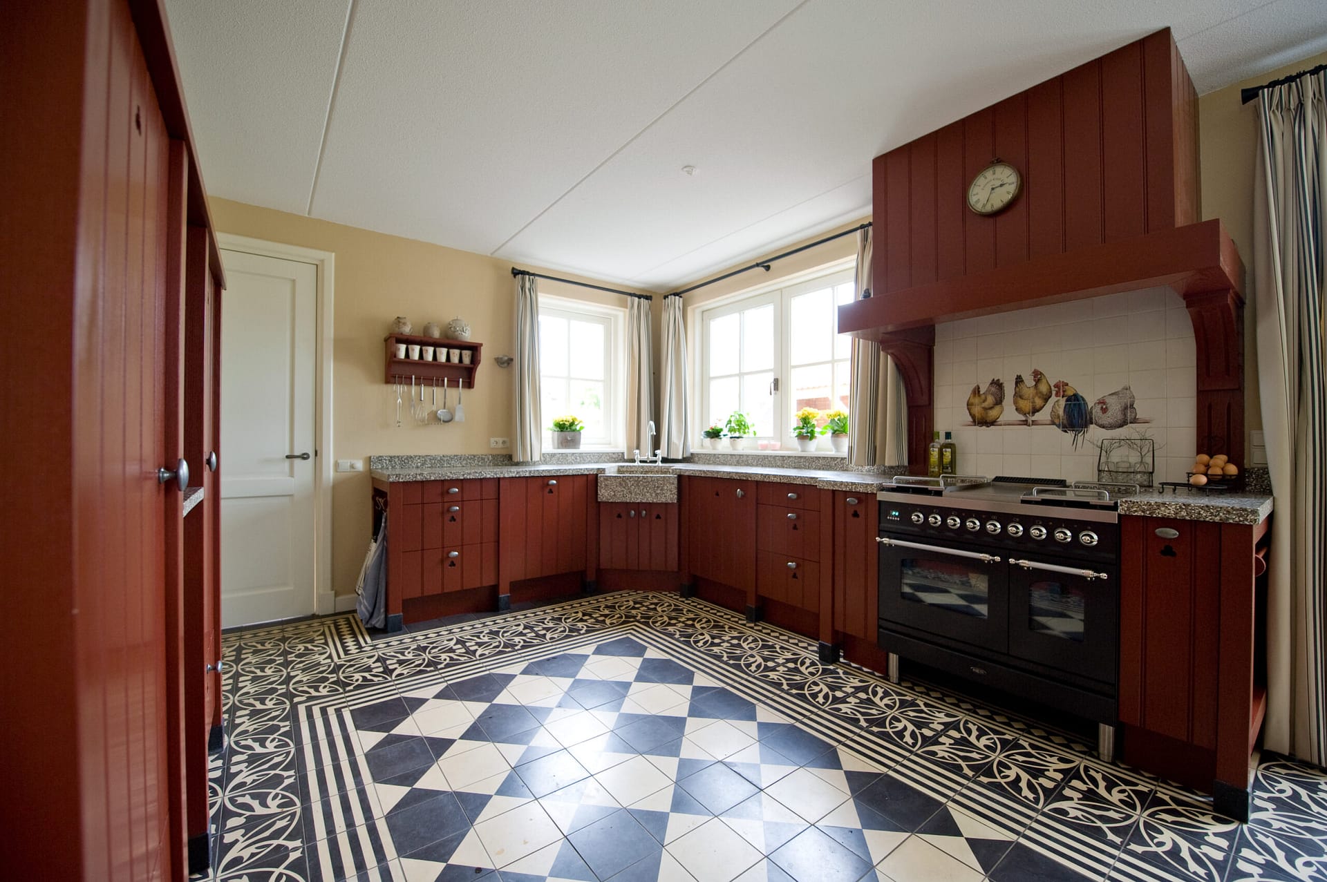 Deze landelijke keuken met een warme rode kleurstelling straalt karakter, ambacht en gezelligheid uit. De klassieke paneelfronten in combinatie met robuuste vormen geven de keuken een authentieke uitstraling die perfect past binnen een landelijke of boerderijstijl.