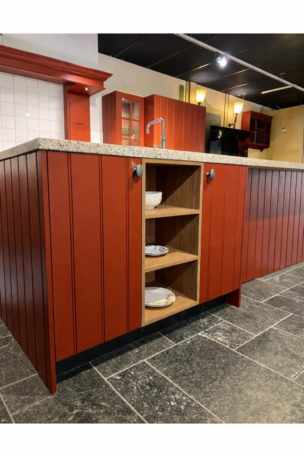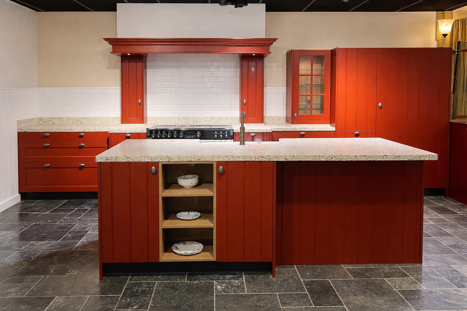 Het ruime kookeiland vormt het centrale punt van de keuken en is afgewerkt met verticale panelen die het ambachtelijke karakter versterken. Het werkblad met natuursteenlook zorgt voor een mooi contrast met de warme rode fronten en biedt volop ruimte om te koken, te bereiden of gezellig samen te komen. In het eiland is een praktische spoelbak met klassieke quooker kraan verwerkt en aan de voorzijde bevinden zich open houten schappen die zorgen voor een speels en praktisch detail.