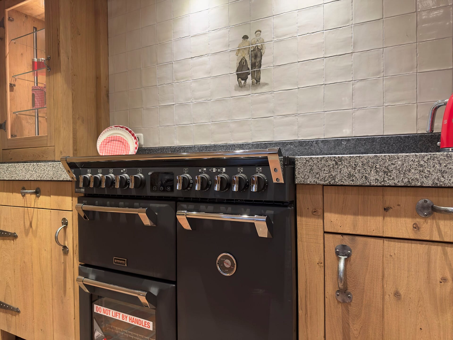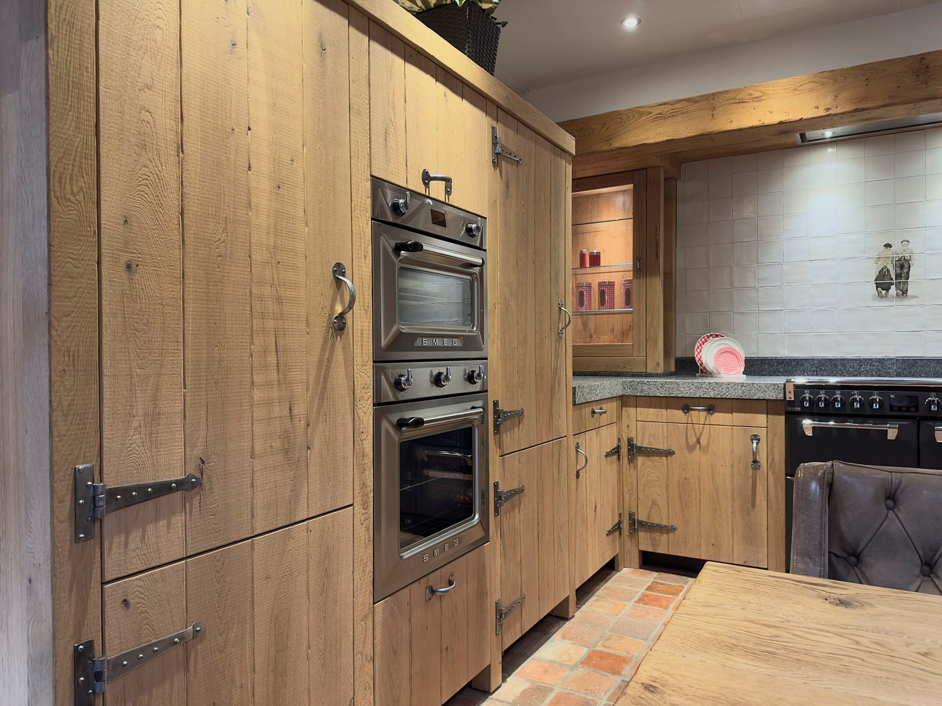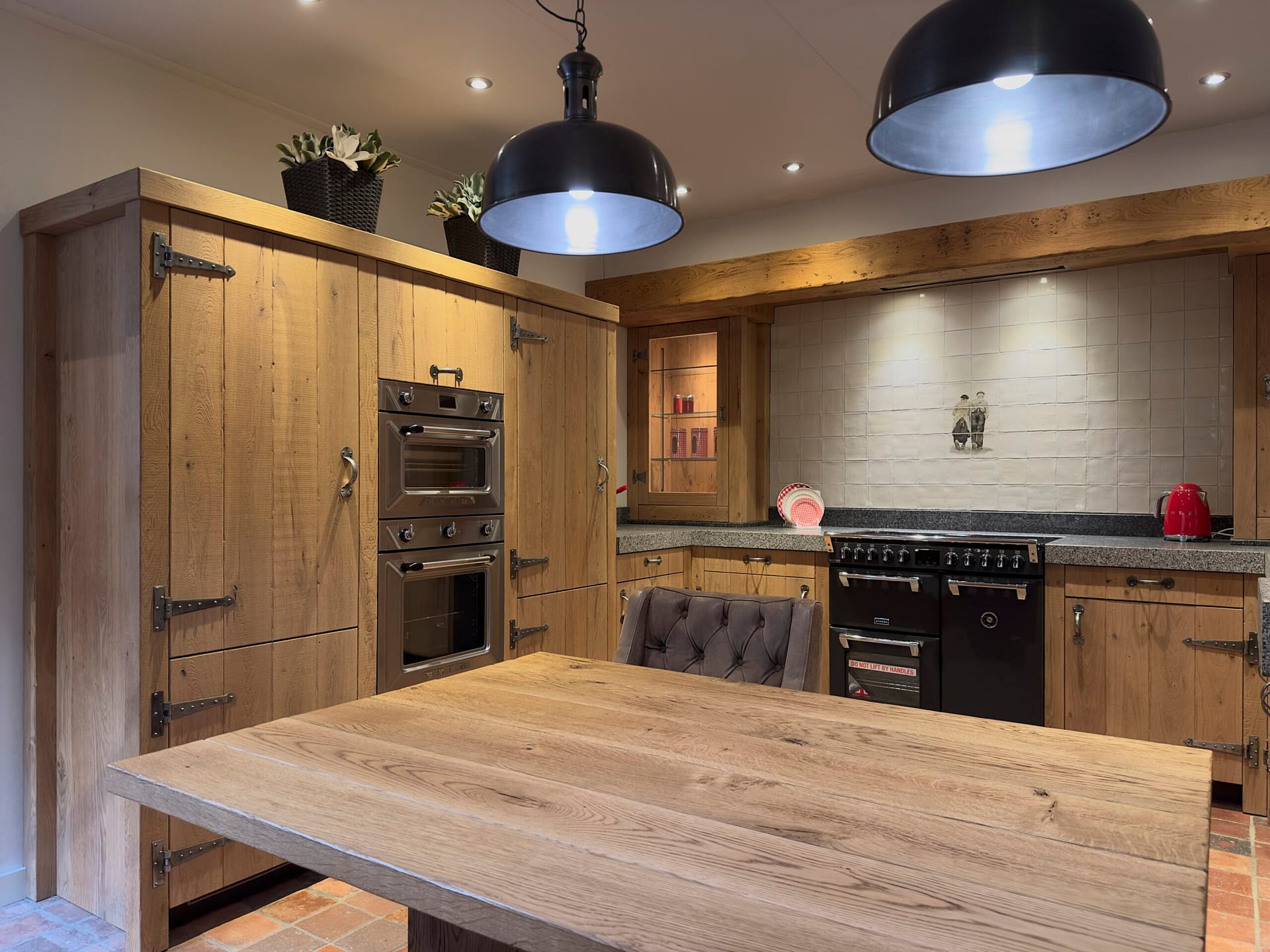 Deze keuken is een toonbeeld van ambacht en kracht, geïnspireerd op de authentieke boerenstijl met een eigentijdse retro twist. De massief eiken fronten zijn gestraald en gebrand, wat zorgt voor een doorleefde uitstraling en een voelbare structuur die het natuurlijke karakter van het hout versterkt. Deze afwerking geeft de keuken een warme, stoere basis met een ambachtelijke uitstraling.
