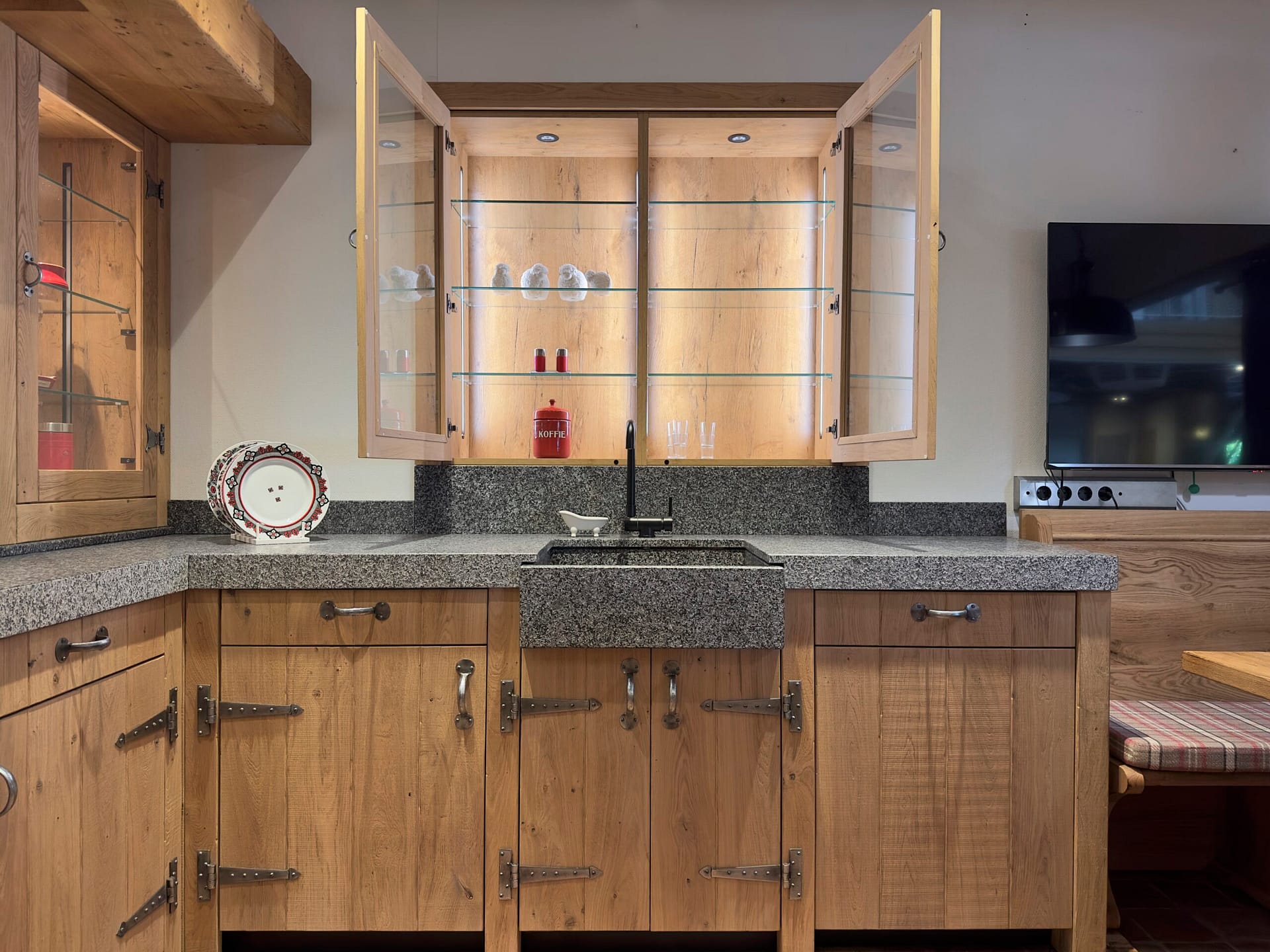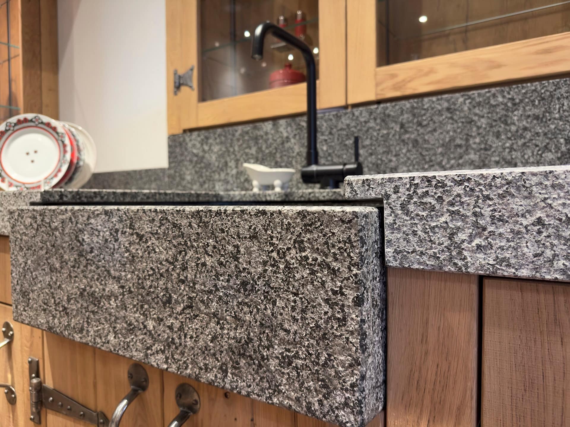 De robuuste U-opstelling biedt volop werkruimte en opbergruimte, perfect voor wie functioneel wil koken zonder in te leveren op stijl. Het granieten werkblad is maar liefst 8 centimeter dik en is uitgevoerd in een diepe, natuurlijke tint. Bijzonder detail is de voorzet onderbouw spoelbak, uitgevoerd in hetzelfde graniet als het werkblad — dit zorgt voor een prachtig, naadloos geheel.