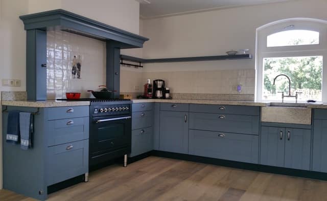 Deze opvallende keuken combineert landelijke charme met klassieke details en een knipoog naar retro design. De fronten zijn uitgevoerd in blauw gelakt hout, wat zorgt voor een uniek kleuraccent dat warmte en karakter toevoegt aan de ruimte. Het terrazzo werkblad van 5 centimeter dik vormt een prachtig contrast met het diepe blauw van de fronten, en geeft de keuken een robuuste, stijlvolle uitstraling.