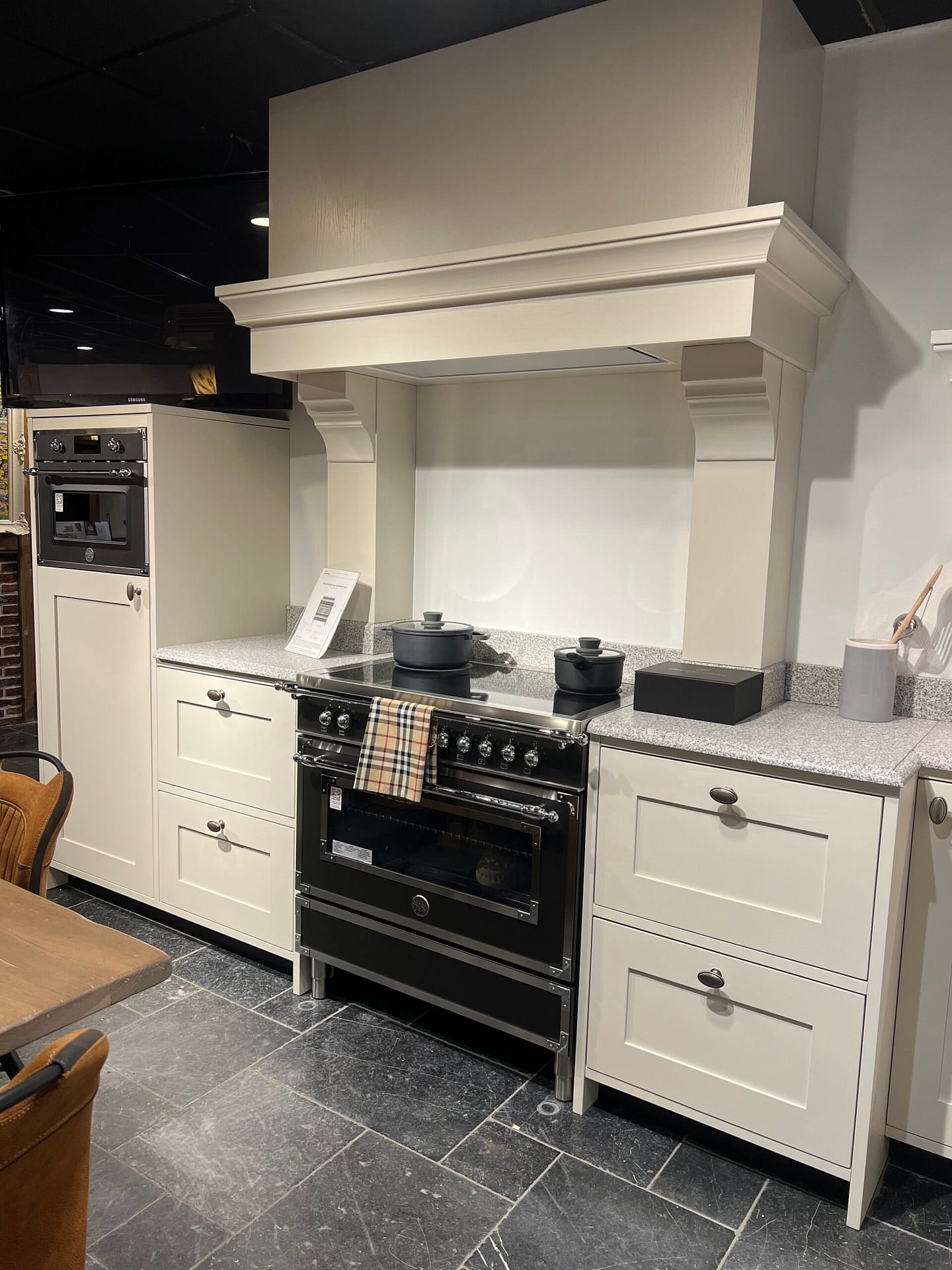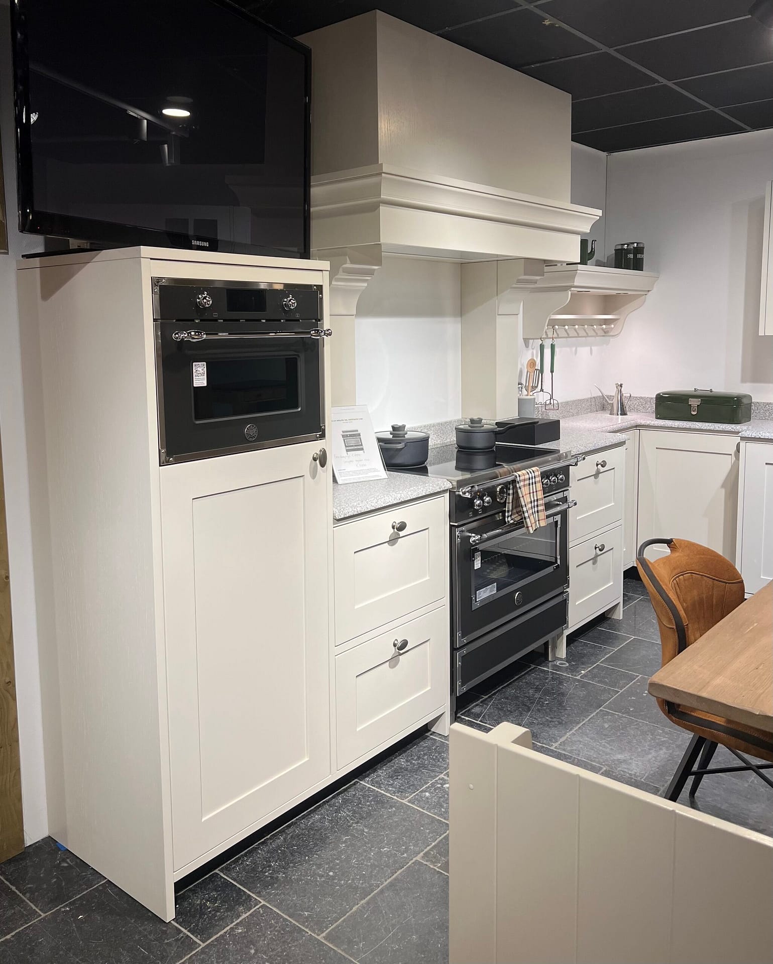 Het brede Bertazzoni fornuis vormt het hart van de keuken en biedt volop ruimte voor uitgebreid koken. Daarnaast is de keuken uitgerust met moderne apparatuur zoals de Bertazzomi combioven, een Siemens vaatwasser, Inventum koelkast en een klassieke kraan van Lorreine. Met daarbij ruime opbergkasten en robuuste lade-indeling. De stijlvolle grepen en het contrastrijke donkere fornuis zorgen voor een verfijnde en harmonieuze uitstraling.