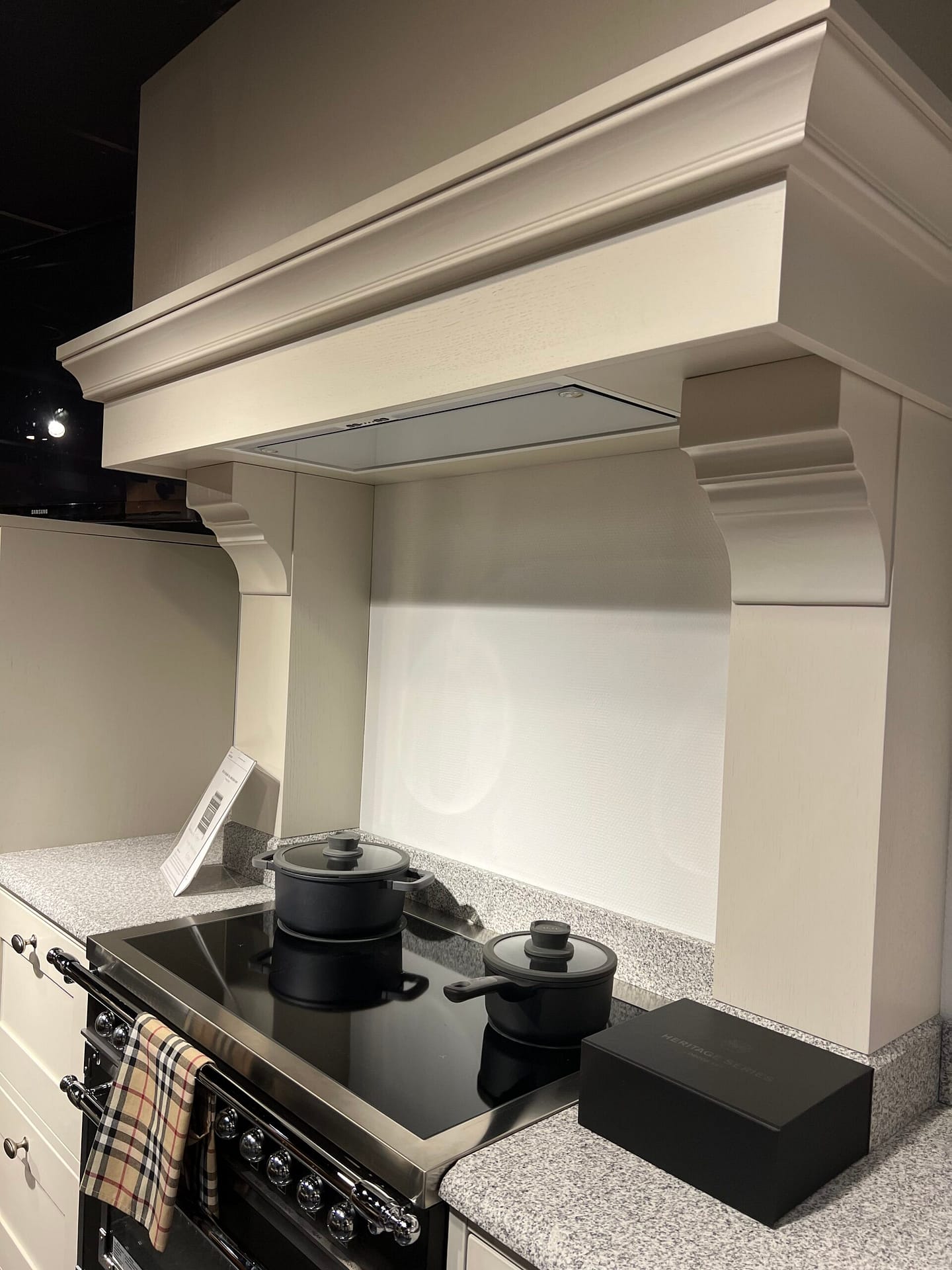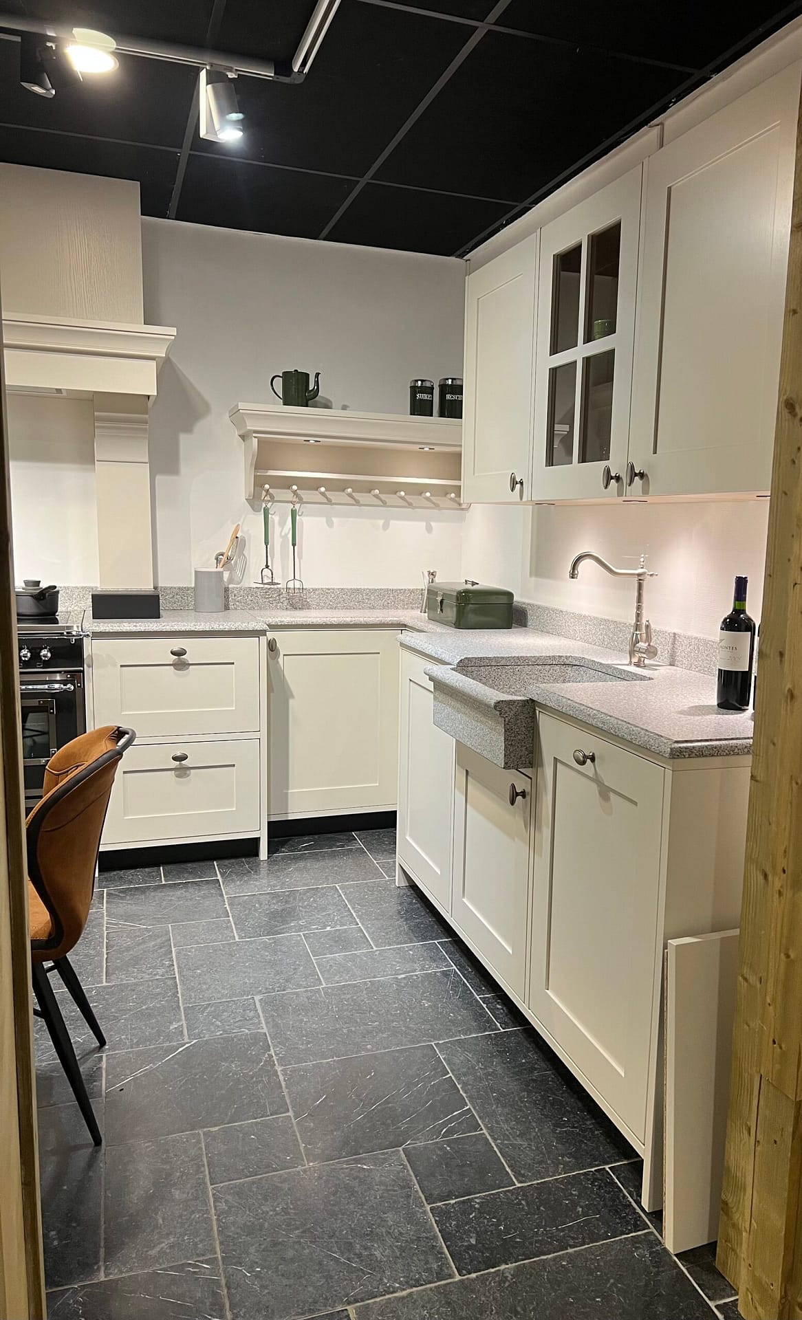 Deze elegante landelijke keuken combineert klassieke details met modern kookcomfort. De zachte crèmekleurige fronten met subtiele belijning geven de keuken een tijdloze en stijlvolle uitstraling. Het werkblad met fijne structuur zorgt voor een luxe en duurzame afwerking, terwijl de royale schouw boven het fornuis een echte blikvanger is en het landelijke karakter versterkt.